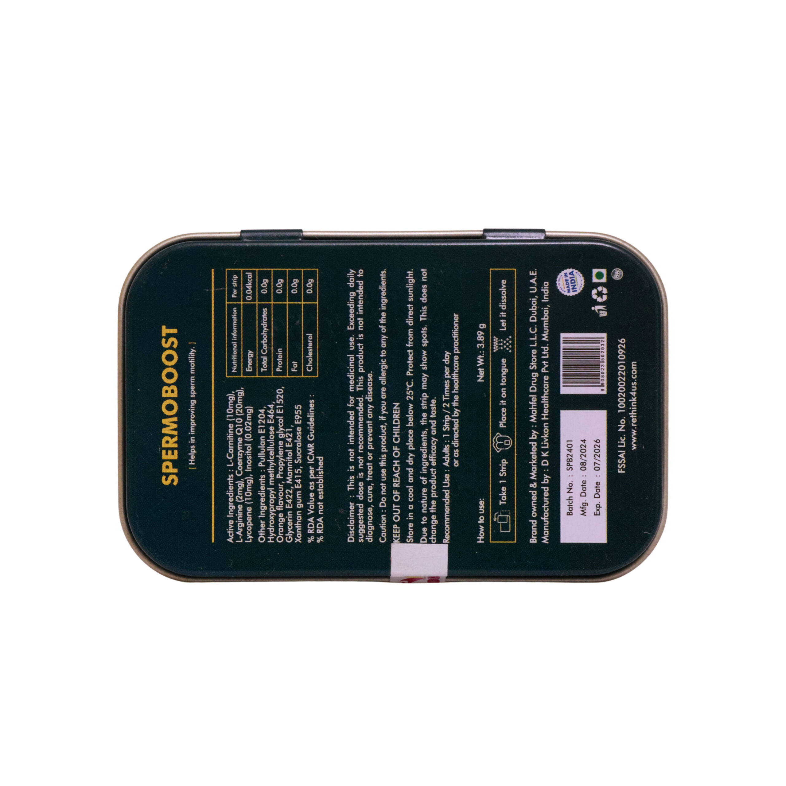 Spermoboost is a sublingual supplement designed for fast absorption. It combines L-carnitine, L-arginine, CoQ10, lycopene, and inositol to support men’s vitality, cellular health, and overall wellbeing as part of a balanced lifestyle.